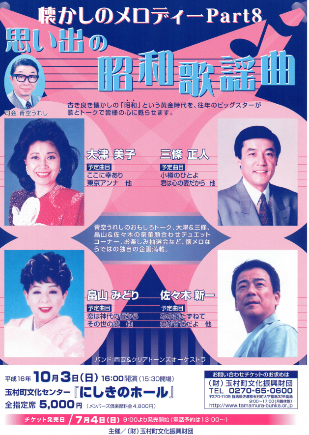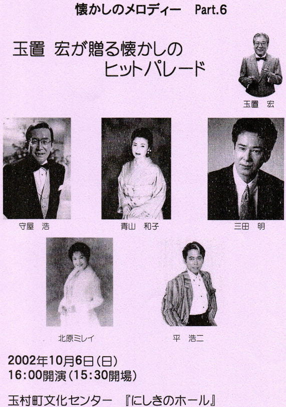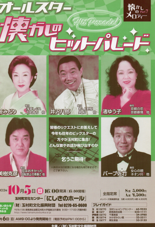 ジャッキー吉川とブルーコメッツ平 浩二園まり中尾ミエモト冬樹三田 明栗田貫一清水アキラ布施辰德神 奈 月松村邦洋ツートン青木マギー司郎青山和子あべ静江伊藤咲子大場久美子大津美子渚 ゆう子畠山みどりビリー・バンバンチェリッシュ辺見マリ井沢八郎バーブ佐竹美樹 克彦本田美奈子海原純子三條 正人佐々木新一笹みどり北原ミレイ守屋 浩玉置 宏青空うれし尾藤イサオX-GUNビューティーこくぶ亘 哲兵美川憲二民秋貴也よっぴ星乃泉水森 進伍斉藤京子都ひばりおやーじ北島KUMA翔 子白鳥聖子こぶ茶バンド(仲本工事・高木ブー・加藤茶)